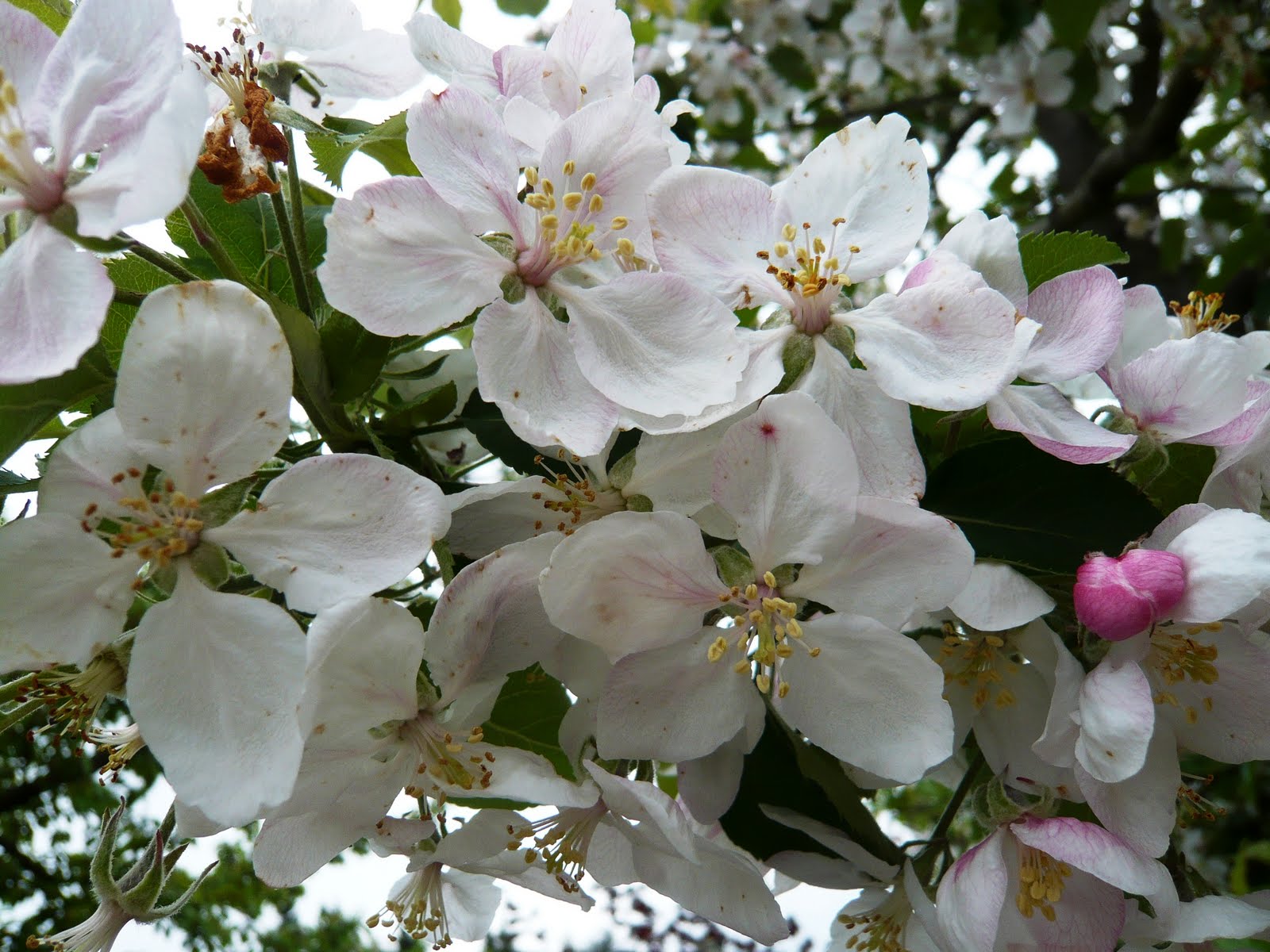 Die Apfelbäume stehen in voller Blüte, aber ich kann keine Bienen sehen. Nur eine Hummel kam vorbei. Ich glaube die Bienen bleiben lieber in ihrem Bienenstock, aber wird´s dann Äpfel geben ???